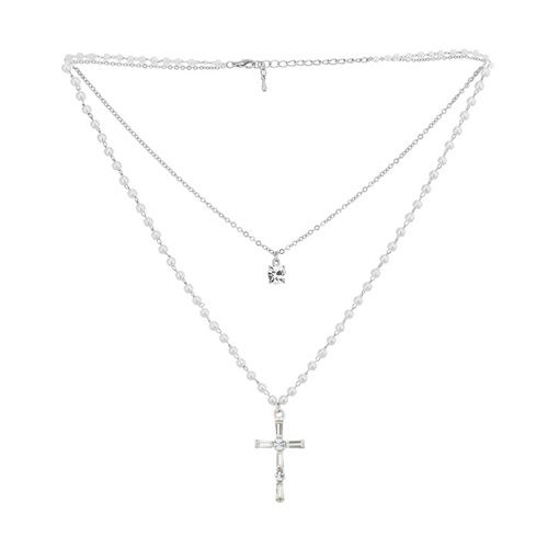 - 케이제이아스타 스와로브스키 스톤 십자가 두줄라인 진주 목걸이 실버 KJN09272