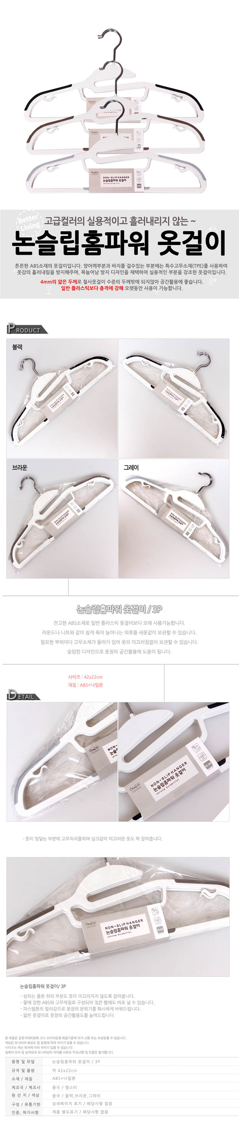 양어개부분과 바지를 걸수있는 부분에는 특수고무소재를 사용하여 옷감의 흘러내림을 방지해주며 목늘어남 방지 디자인을 채택하여 실용적인 부분을 강조한 옷걸이입니다