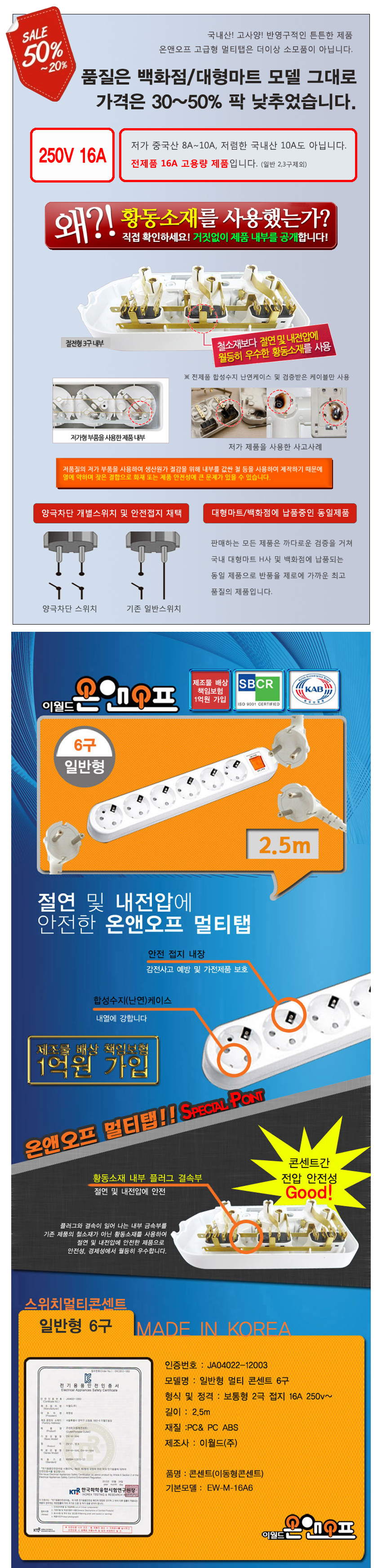 국산 온앤오프 일반형 멀티탭 6구 2.5m/접지 멀티탭/절전형/멀티 콘센트/멀티코드 (전기소모품/케이블)