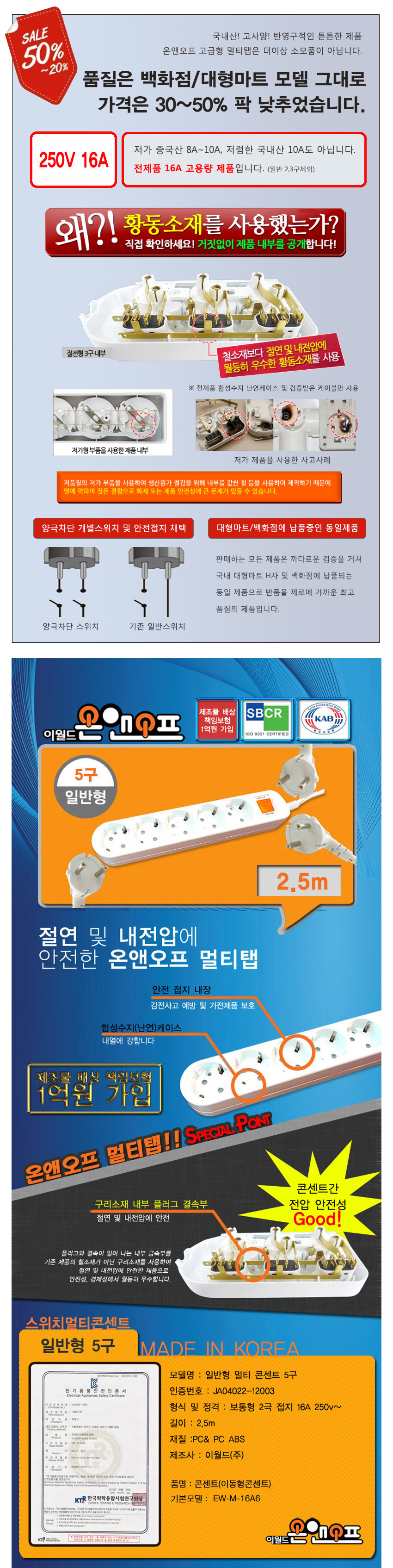 국산 온앤오프 일반형 멀티탭 5구 2.5m/접지 멀티탭/절전형/멀티 콘센트/멀티코드 (전기소모품/케이블)
