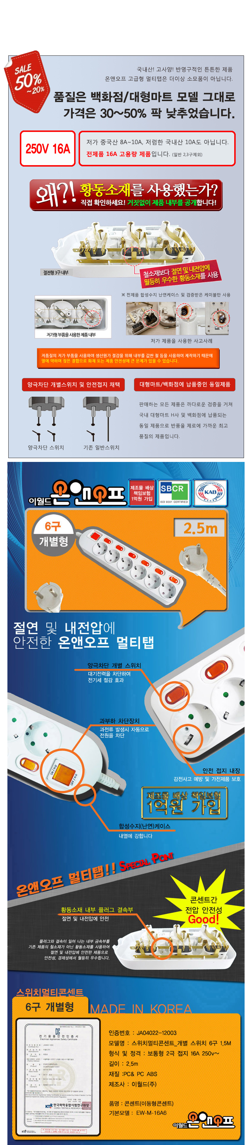 국산 온앤오프 절전형 개별 멀티탭 6구 2.5m/접지 멀티탭/멀티 콘센트/멀티코드/개별스위치 (전기소모품/케이블)