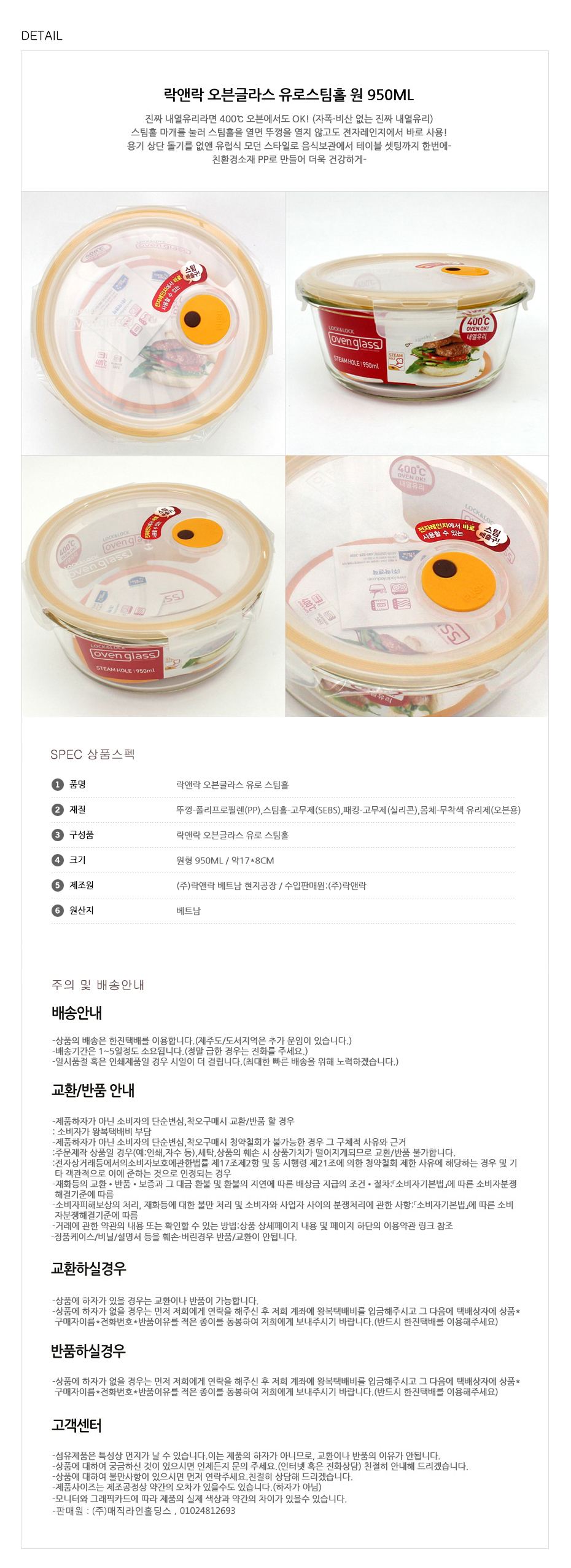 락앤락 오븐글라스 스팀홀(락앤락 스팀홀원형950) (글라스밀폐/유리용기)