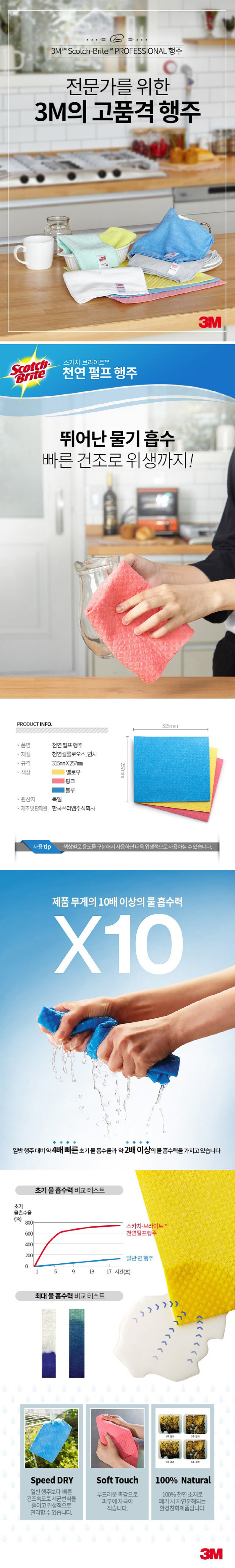 3M 스카치 브라이트 천연펄프행주 (3입/분홍+노랑+파랑) (수세미/병솔/잡화)