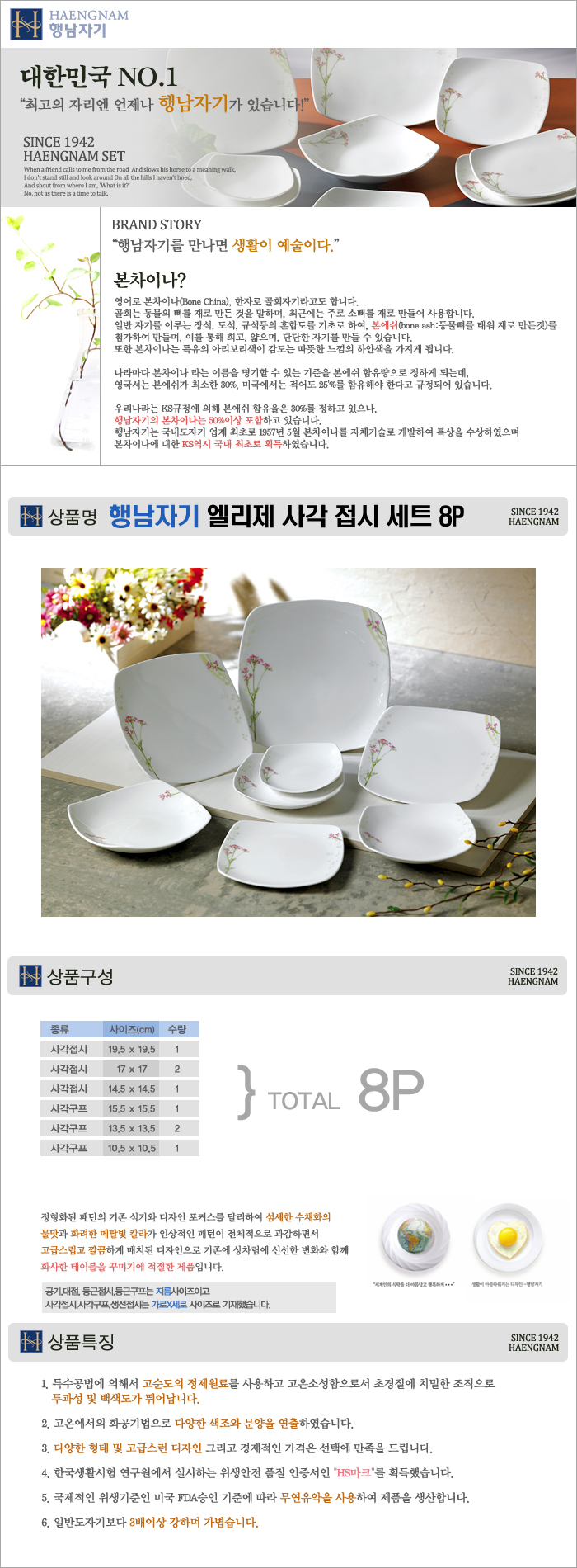 행남자기 엘리제 사각접시세트8p (접시/찬기/성인식판)