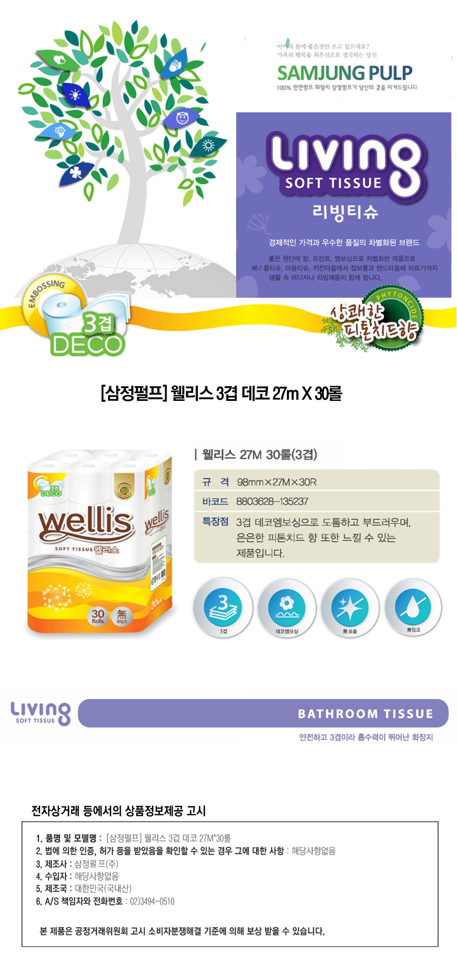 [삼정펄프] 웰리스 3겹 데코 27M*30롤 (화장지/티슈)
