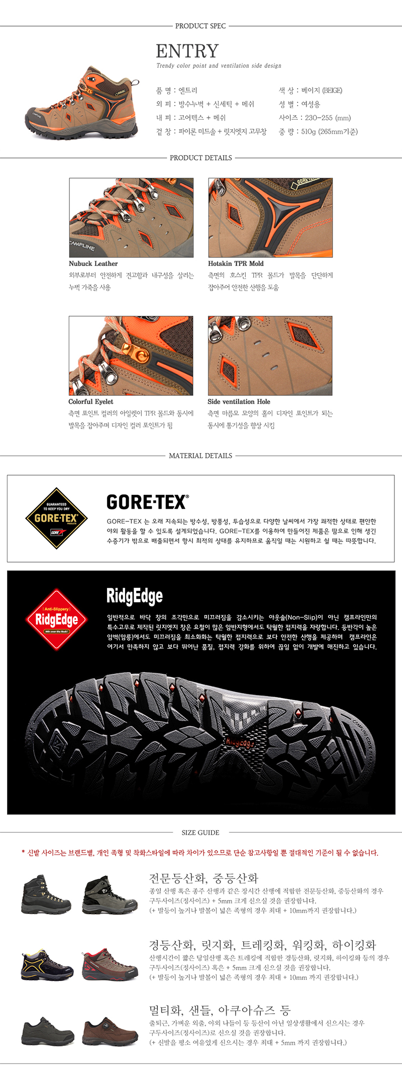 캠프라인 엔트리 고어텍스 경등산화 [여성용] 베이지