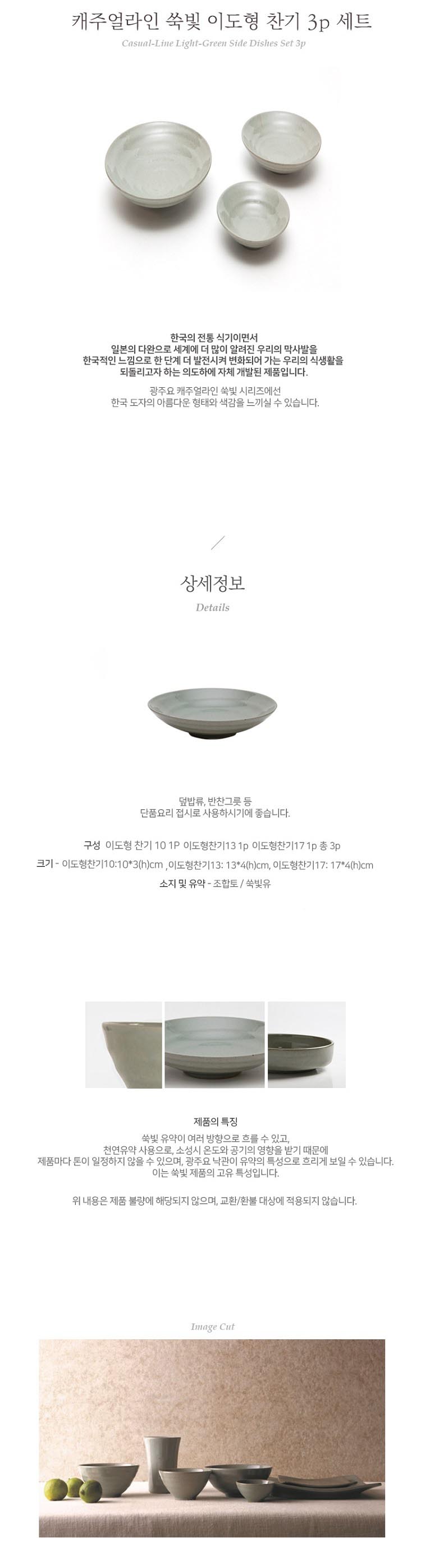 이도형찬기 10 1P, 찬기13 1P, 찬기17 1P, 총 3P / 캐주얼라인은 광주요가 독자 개발한 백자 질감 조합토 소지를 사용해 심미성을 높였으며, 조합토 특유의 알갱이 느낌으로 질감미를 표현했습니다.