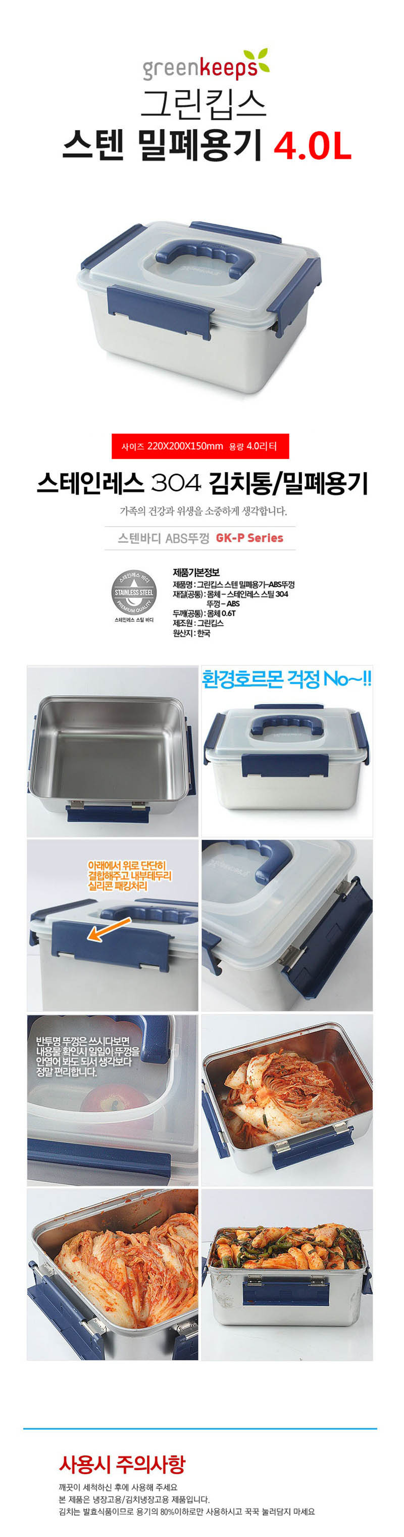 [그린킵스] 스텐 김치통 대용량 밀폐용기 4.0L GK-PP4.0