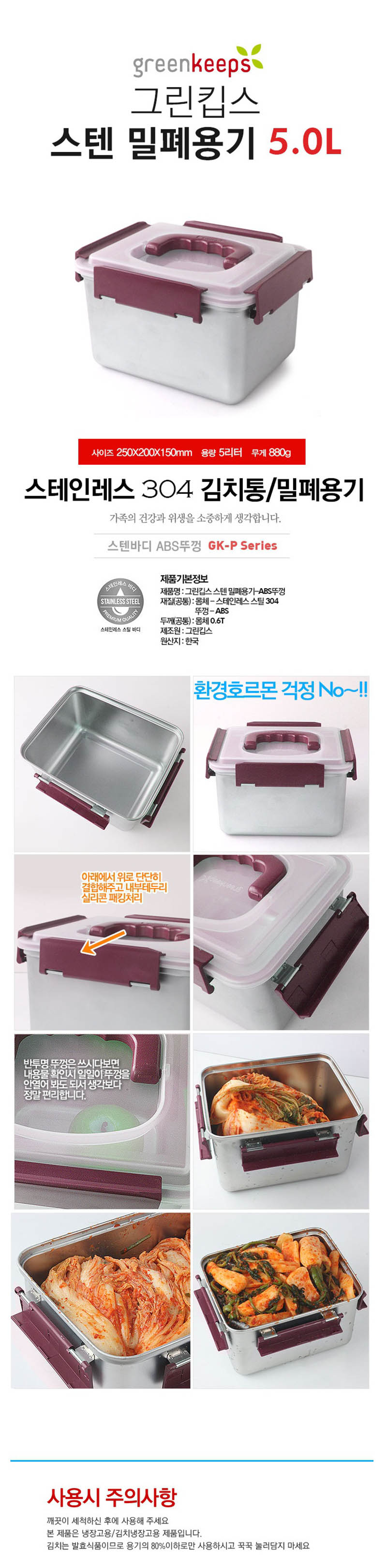 [그린킵스] 스텐 PP뚜껑 김치통 5.0L