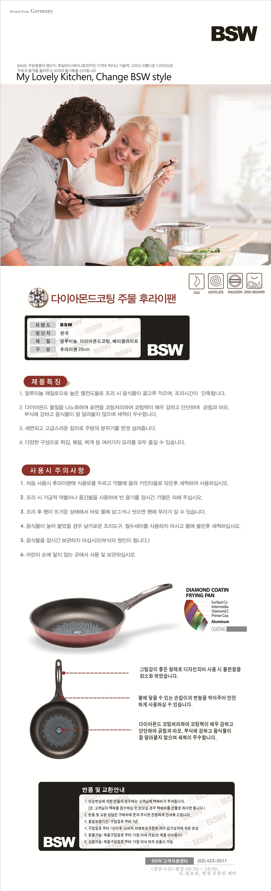 [BSW] 다이아몬드 주물 후라이팬 26cm(와인)