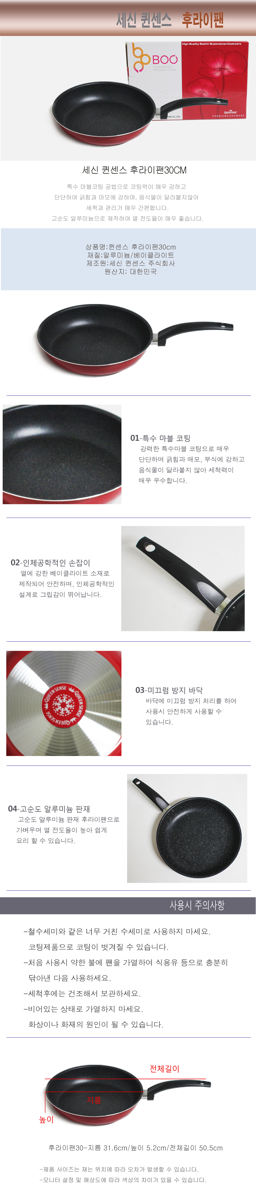 특수마블코팅으로 매우 단단하며 긁힘과 부식에 강하고 음식물이 달라붙지 않습니다.바닥에 미끄럼 방지 처리를 하여 사용이 안전합니다