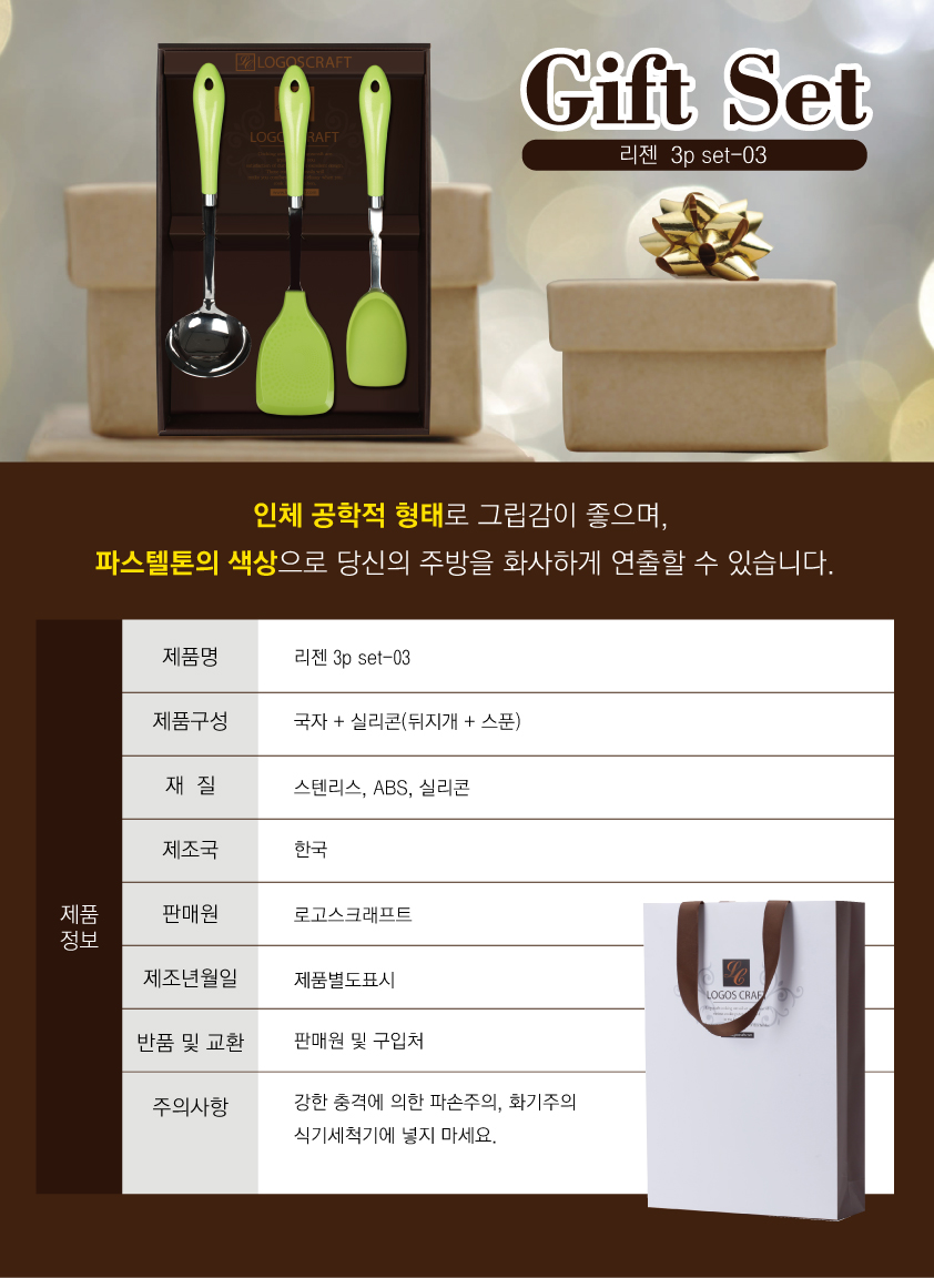 국자+실리콘뒤지개+스푼 구성으로 인체공학적 형태로 그립감이 좋으며 파스텔톤의 색상으로 당신의 주방을 화사하게 연출할 수 있습니다