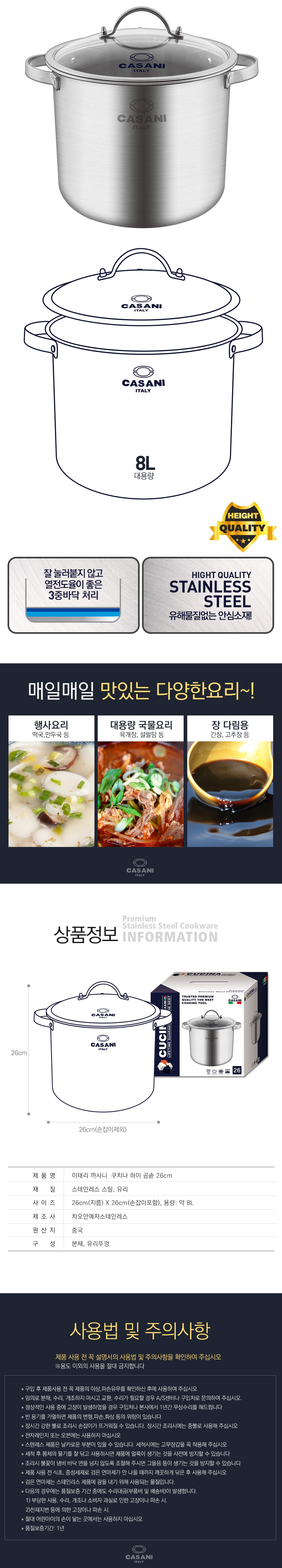 고 품질 스텐레스를 사용하고 있으며 기존 곰솥보다 높이를 높여 더 많은 양의 요리시에도 편리하게 사용할 수 있도록 제작되었습니다