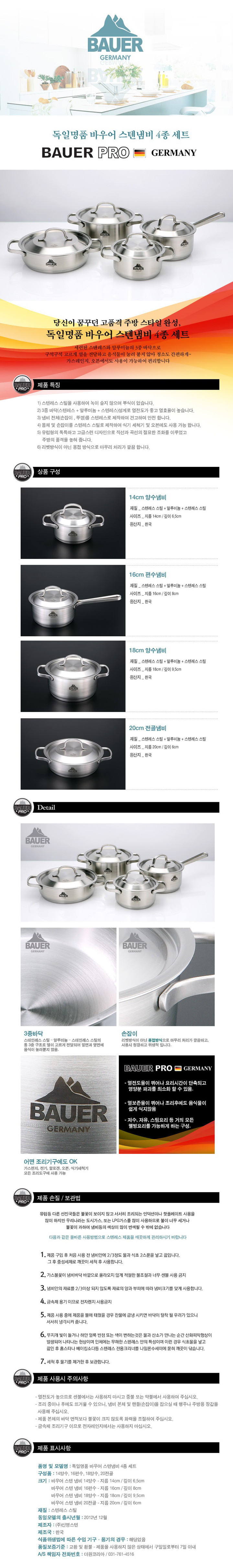 [BAUER PRO GERMANY] 독일 바우어 프로 스텐냄비 4종 세트 (14양수, 16편수, 18양수, 20전골)