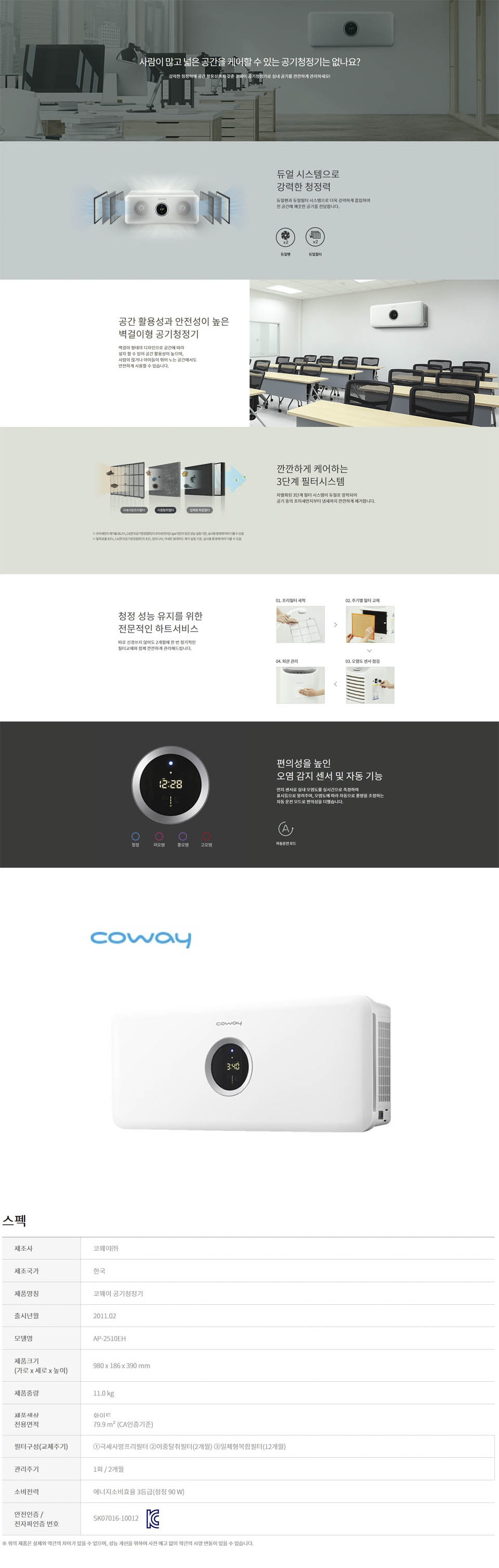 [코웨이] 케어스 벽걸이형 공기청정기 84㎡[무료설치] AP-2510EH