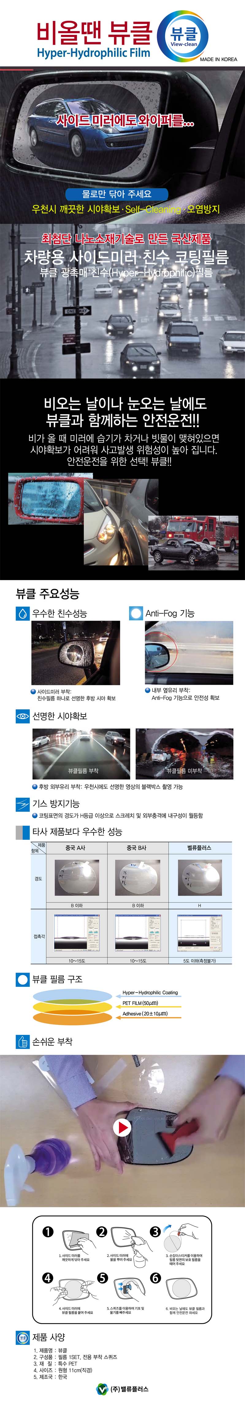사이드미러 부착(친수필름 하나로 선명한 시야확보) 내부 옆유리 부착(Anti-Fog 기능으로 안전성 확보) 선명한 시야확보(후방 외부유리 부착..우천시에도 선명한 영상의 블랙박스 촬영 가능)